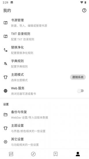 1、书源管理:提供多种导入书源方式,如新建、本地、网络导入等,可管理大量书源,启用或禁用特定书源,方便获取不同来源的小说资源。