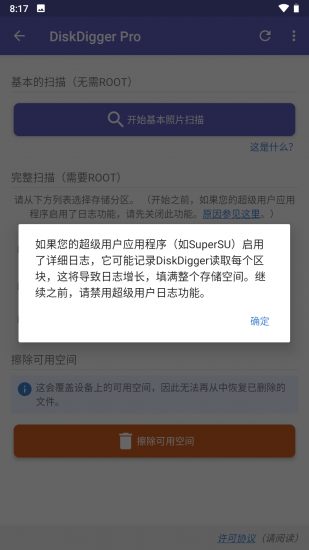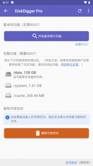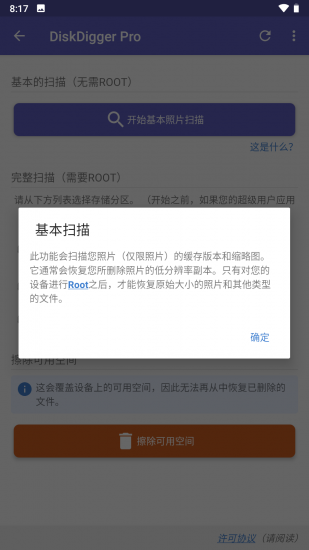 2、注意:如果您的设备没有植根,该应用程序只能对已删除的照片执行“有限”扫描。为了能够搜索其他类型的文件,并搜索您设备的整个内部存储器,设备需要获得 root 权限。在非 root 设备上,该应用程序只能恢复它在设备缓存和缩略图目录中找到的低分辨率版本的照片。
