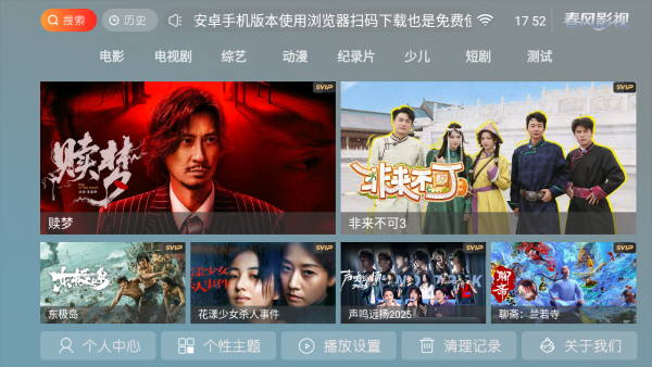 春风影视最新版是一款非常不错的影视追剧软件,该软件画质也是非常清晰的,采用了特有的技术,无需担心出现模糊的情况发生。同时,还主打越多人播放越流畅哦。此外,遇到不错的影视资源还可以一键添加到喜欢的列表中,下次查找起来就十分方便了。支持在线观看和离线下载,没有流量的朋友也可以轻松进行观看哦。不仅如此,春风影视TV盒子版为用户们提供了海量影视资源等着用户们在线观看,各种类型的影视视频用户们都轻松在软件上观看到,简直不要太舒服哦。有了这款软件之后,让你一次性看个够!除此之外,这款软件还添加了夜间模式,这样你看多久都无需担心伤害到眼睛,十分贴心。有需要的朋友还在等什么,心动不如行动,快来下载体验吧!更多精彩、有趣的等你前来发现!