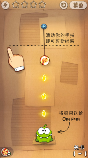 割绳子前传中文版是一款非常耐玩的休闲闯关游戏,也是曾经风靡全球的经典游戏之一。游戏的画面是采用了卡通风格设计而成,再配上可爱的小吃货形象,能够为玩家带来一场愉悦的视觉体验。进入游戏时玩家将看到一个小吃货,要做的事情就是滑动手指将捆绑在绳子上的糖果送到小吃货的嘴里既可,虽然说起来很容易,但是在此期间玩家也需要收集三颗星星,不然就无法完美通关,也就体验不了接下来的关卡,为此玩家在滑动手指之前,最好先思考一下,尽量一步到位。此外,割绳子前传中文版为玩家提供了丰富多样的关卡,且关卡难度也会逐渐提升哦!