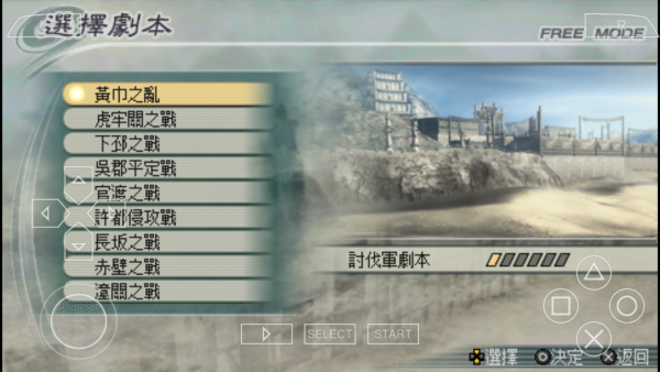 可以随意选择关卡的模式。当无双模式中的某个关卡通关后,即可在自由模式中选择该关卡以及相应的担当势力。