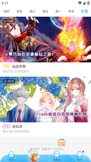 漫画台app官方版是一款超级好用专业的手机漫画阅读软件,很多漫迷都在推荐的漫画阅读器,用来看漫画极为不错的,能够全方位满足所有人的追漫需求,精彩漫画看不停,让你再也没有漫荒的烦恼。软件内的各种漫画资源数不胜数,且每天都在更新,精彩热门漫画随时在线阅读,全都是很高清流畅的画质,图片质量超高,还能一边看漫画一边评论哦,超多喜爱漫画的朋友聚集在这里,尽情享受追漫的乐趣。软件内汇聚大量的漫画资源在这里,只有你想不到没有找不到的漫画,软件能够支持阅读记录的查看,为所有爱看漫画的你带来超丰富的优质资源,全天随时为你更新新作品,阅读非常方便,让你可以随时去快速搜索自己爱看的漫画。漫画台app正版内的漫画题材超丰富,总有你喜欢的,还有漫画周期表,每天的不同漫画资源,随时都能在线阅读,喜欢的漫画可以收藏或者缓存哦,爱看漫画的朋友快来本站下载吧!