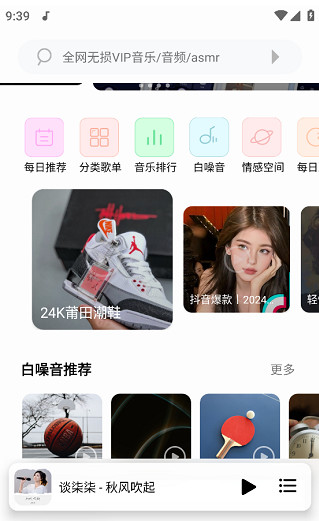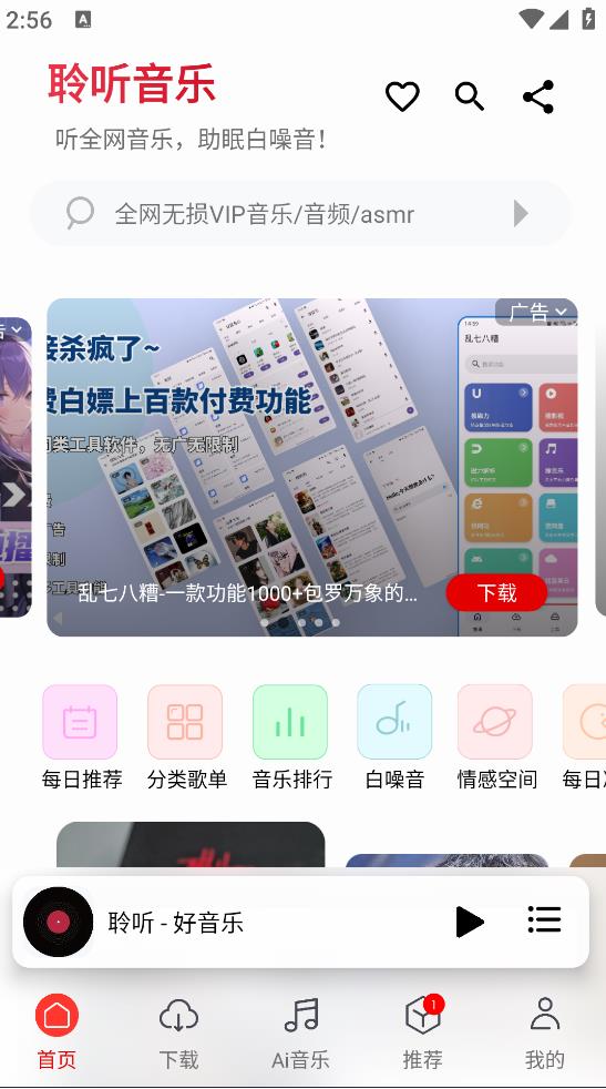 聆听音乐无广告版是一款专门为喜欢听歌的朋友量身打造的音乐播放器,完全免费的听歌神器,很多音乐爱好者都在使用,里面的歌曲资源超多,用户可以轻松的听歌,各种热门歌曲都能听到,每天还有各种热门歌曲,可以为用户提供极致音乐体验。软件无需注册登录,打开就能直接在线听歌,里面有流行歌曲、摇滚音乐、电子音乐等等不同风格的音乐,每个人的听歌喜好全都可以满足,完全不用担心歌荒哦!软件内置强大的搜索引擎,支持全网音乐搜索,无论其来源于哪个平台的音乐,都能轻松找到,所有歌曲想听就听,每天还会为你推荐各种热门歌曲,都是大家在听的,完全不会踩雷。聆听音乐纯净版内的音乐有多种音质可以切换,并且全都支持下载缓存,没有网络也能在线听歌,喜欢听歌的朋友快来下载吧!