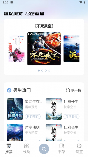 1、简洁的界面设计:在首页上选择男生或女生专区,快速找到热门小说推荐。