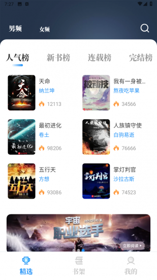 3、【小说榜单】每天在首页为大家展示、人气榜、新书榜等;