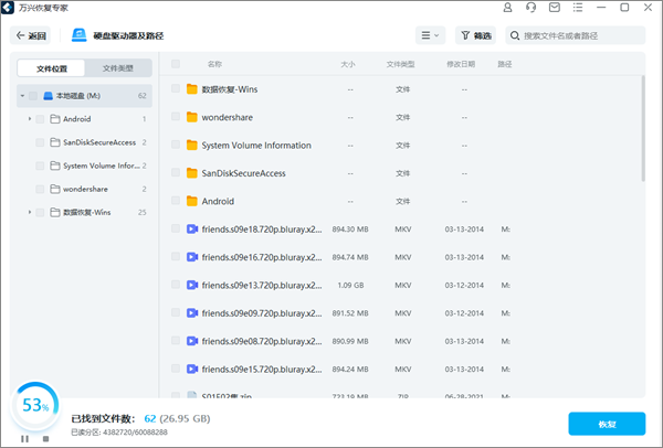 万兴恢复专家官方版是一款专业级别的电脑数据恢复软件,目前很多的公司大企业都在使用,是万兴科技旗下很知名的数据恢复神器,并且恢复率也非常高,可以满足所有人的数据恢复需要。软件可以支持硬盘、电脑、回收站、存储卡等超多不同存储工具当中的数据恢复,可以帮助用户一键扫描设备中的丢失的文件,它支持的文件类型也很多样哦,提供恢复视频、图片、文件、音乐等等数百种格式,并且在恢复之前还可以提前预览哦,让你电脑里丢失的各种数据失而复得。很多小伙伴总是在工作当中不小心丢失了一些重要数据,不管是不小心删除还是意外丢失,你都有可能通过该应用找回来,操作也简单,跟着引导简单几个步骤就能轻松完成,内置强大的数据分析引擎提供高效全面的数据扫描结果,不再需要漫长等待,解决你的所有数据丢失问题,有需要的朋友可下载试试!