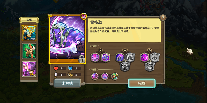 速通组合:雷格森(AOE)+ 游侠(控制)+ 紫法(多段伤害),依赖技能爆发快速减员。