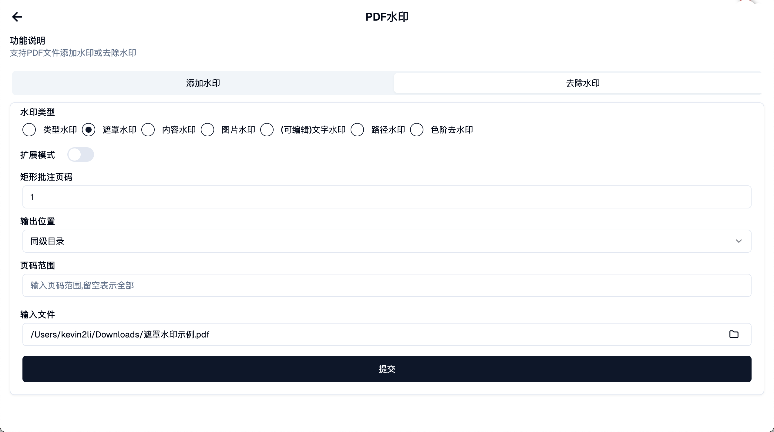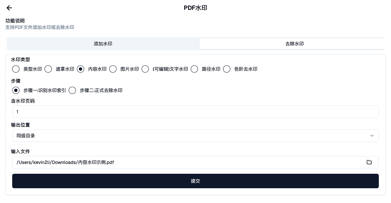 这一步需要填写含水印页码参数,只需要提供一个带有水印页的页码即可。比如这个文件第1页就含有水印,因此填写1。