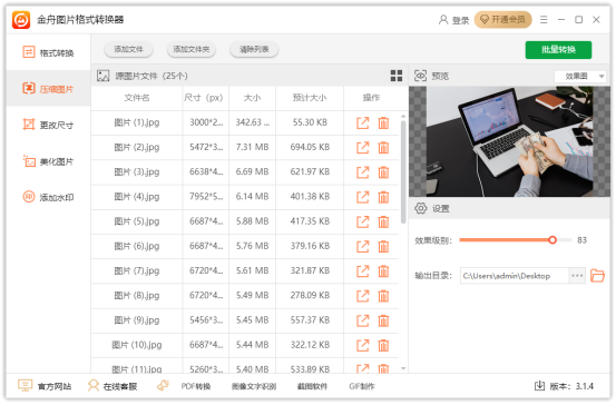 软件支持一键批量压缩图片大小,在右侧效果等级中往右拖动,数值越大图片压缩得越小。