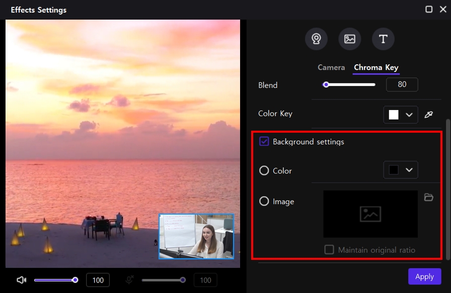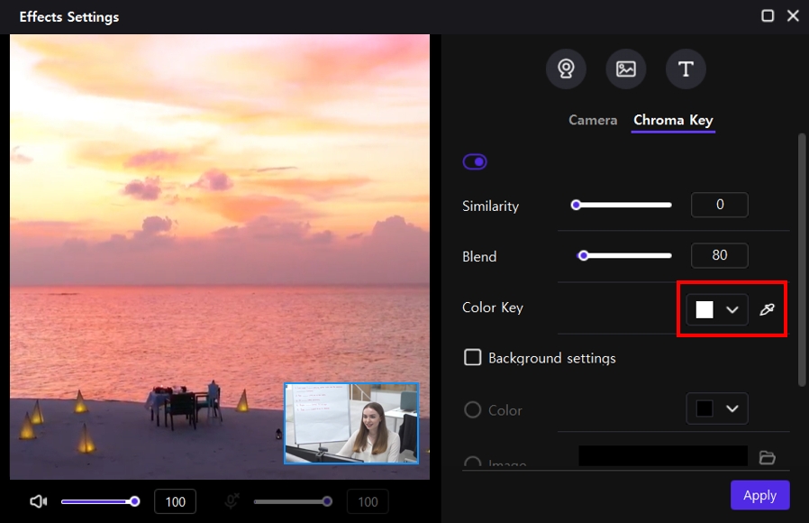 5、选择"背景设置"并配置要插入到色度键区的颜色或图像。
