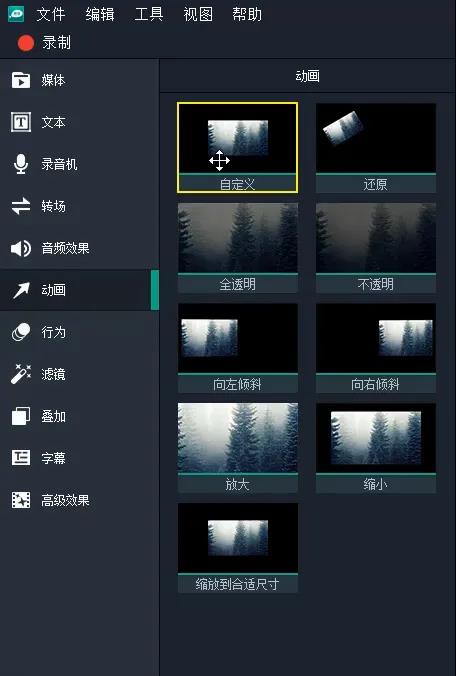4、选中动画选项卡里的自定义效果,拖拽到时间线轨道上的水印媒体上。(自定义较其他动画效果的好处是可以改变混合模式,不透明度,旋转,位置及大小到自己想要的视觉效果。)