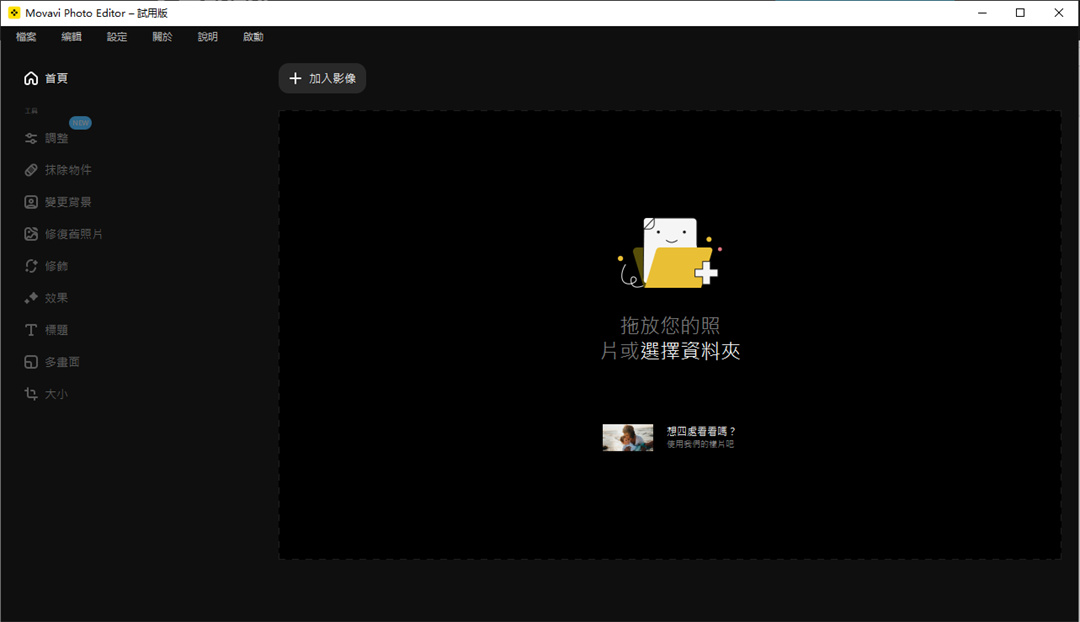 1、点击按钮添加图片或在Windows资源管理器中找到所需的图像,然后将其从Windows资源管理器拖动到Movavi照片编辑器窗口或选择文件夹。