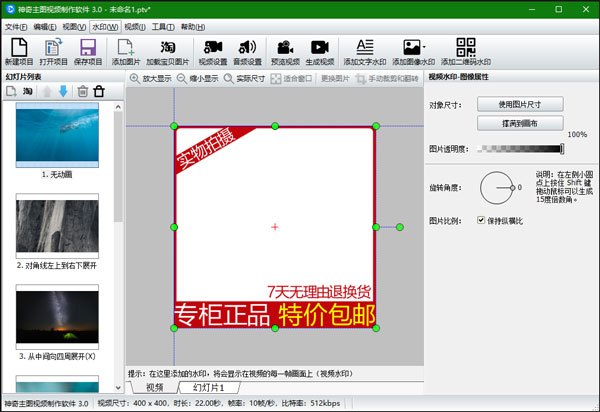 神奇主图视频制作官方版是一款非常优秀的主图视频制作软件,该软件可以给视频添加多种水印,比如:文字水印、图标水印、二维码水印等等,用户可以随意进行切换,满足不同人群的需求。此外,还可以自定义视频尺寸,想怎么设置就怎么设置,十分方便。并且,神奇主图视频制作中文版还有多种编辑功能,可以对照片进行旋转、翻转等等,没有任何拘束。同时,也可以一键添加水印,这样就可以不用担心作品被白嫖了。不仅如此,还有预览功能,可以轻松提前查看效果哦。当然,还有多种特效,可以自由进行加入哦,给你带来不一样的体验感!除此之外,可以批量添加主图照片,大大的提高了工作效率还可以节省不必要的麻烦。觉得这款软件不错的话,可以前来试一试!