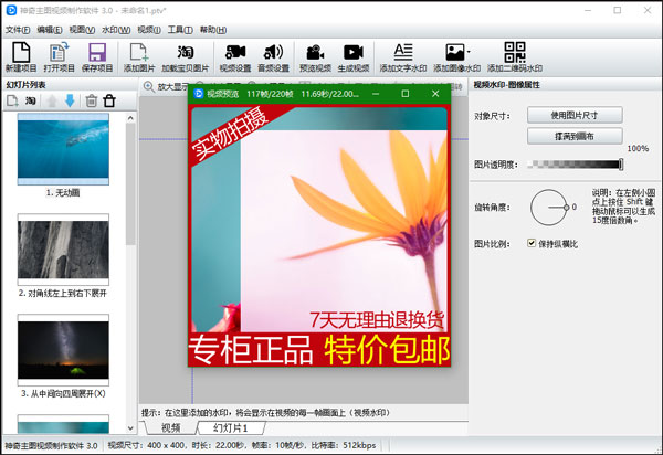 3、每一张图片的属性设置完成后,点击“预览视频”按钮,查看制作好的视频,如下图: