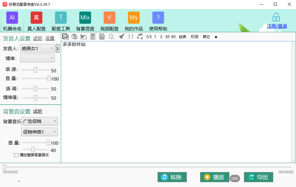 好易迅配音专家官方版是一款非常优秀的语音智能合成软件,该软件界面简洁,操作简洁,也受到了广大好友们的一致好评与青睐。此外,采用了最好的语音识别引擎,使得文本转换更加流畅。并且,提供了各种方言,其中包括:普通话、英语、粤语、童声等等72种发音人的声音,满足不同人群的所有需求。同时,还添加了循环播放功能,支持将生成的语音文件进行循环播放,十分方便。值得一提的是,今天我给大家带来的是“好易迅配音专家中文版”,该版本就不用为看不懂而忧愁了。不仅如此,还新增了真人配音功能,给用户带来一种真实感!除此之外,加载速度快,让用户无需等待太长时间哦。感兴趣的小伙伴们还在等什么,心动不如行动,快来下载体验吧!