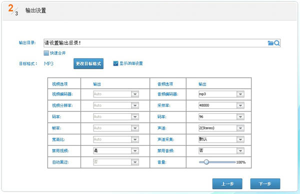 设置目标输出格式为MP3,如果还要进一步的修改音频的码率、采样率等参数,可以自定义设定音频的各项参数!然后点击下一步,你的个性串烧MP3音乐就合并好了,怎么样,MP3音乐合并是不是和传说中的一样简单呢