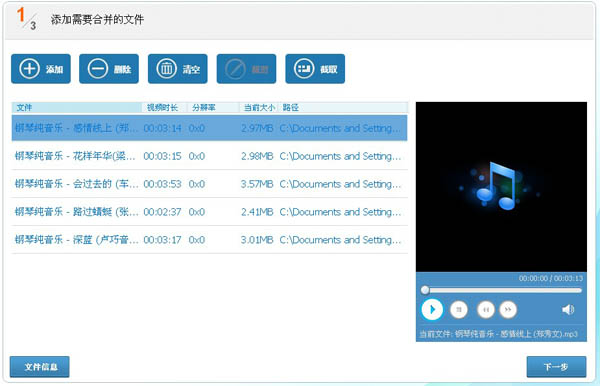 4、音乐合并:把多个不同或相同的音乐格式文件合并成一个音乐文件。