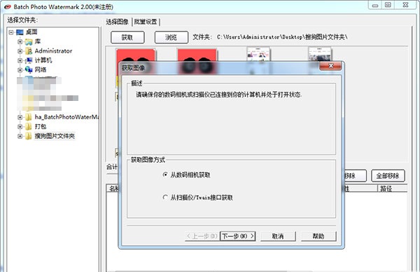 2、当选中文件夹后,图片会显示在右边的预览窗口内,同时软件还支持从数码相机和扫描仪/TWAIN接口中获取图片,点击“获取”按钮,根据提示完成软到即可,点击旁边的“浏览”按钮可以单独查看选中的图片文件。